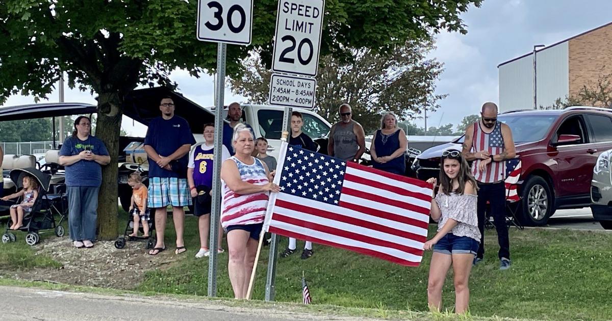 Misty Cox, left, and Kierra Yunker hold an American flag as they wait for the hearse carrying Elwood police officer Noah Shahnavaz to pass through Lapel. pic.twitter.com/UaZdxjUQ8Z